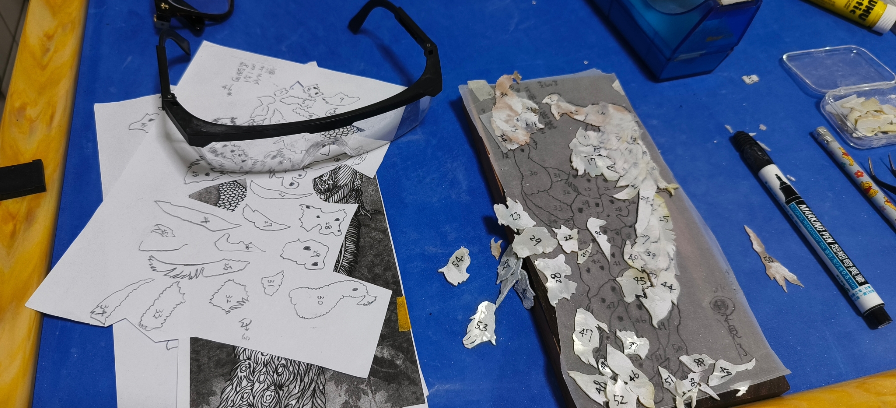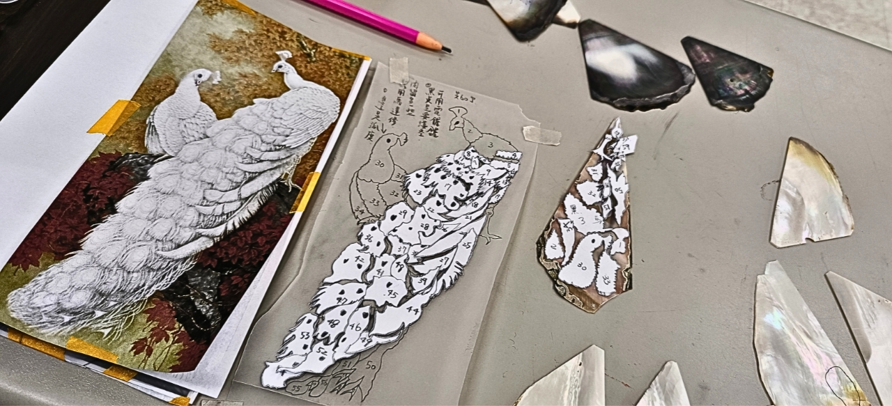 將黏貼在貝殼片上的區塊紙圖,切割好,拼貼在設定好的瓷胎或木胎