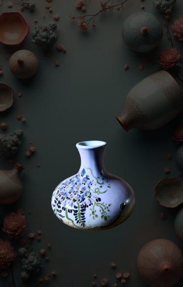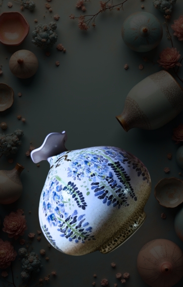 該系列作品均以紫藤為主要裝飾元素,細緻勾勒出紫藤的優雅垂掛與自然柔美,與紫煙釉的煙霧般啞光質感形成完美對比,凸顯作品細膩的藝術氣息。