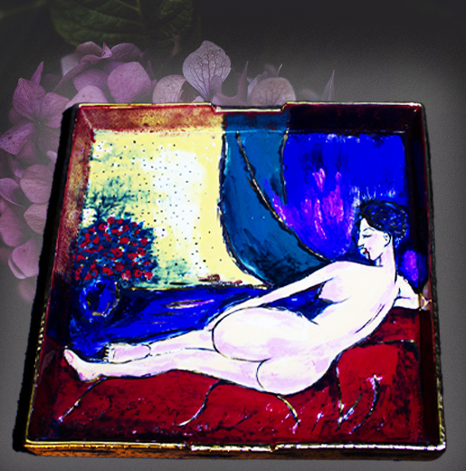 女人的姿態柔和流暢,展現出自然的美與誘人曲線,與周圍色彩豐富、細膩的瓷器形成一種和諧的對比。