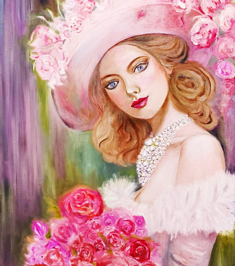 紅粉佳人 這幅油畫中的紅粉佳人宛如一朵盛開的春日花朵,散發出迷人的柔情與優雅。