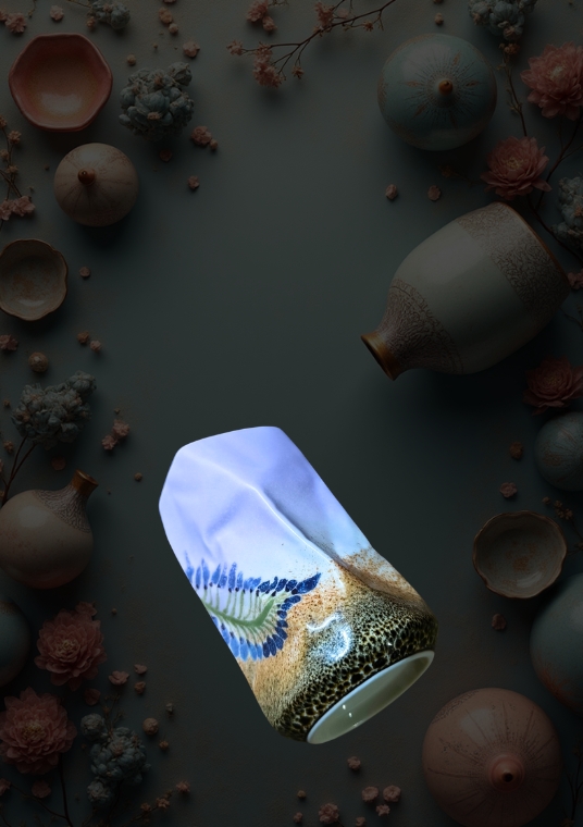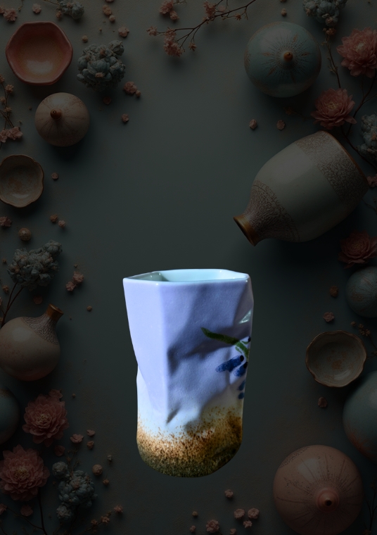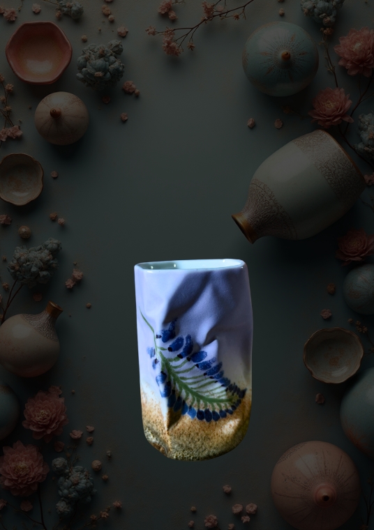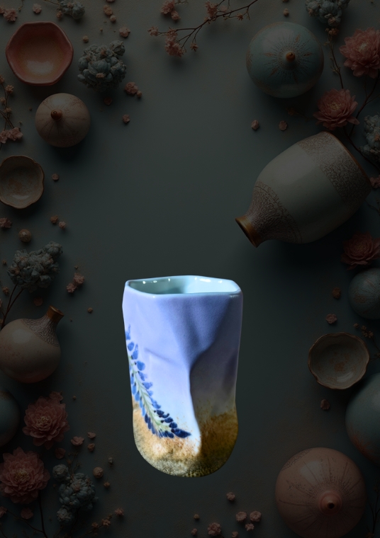 杯身的扭曲設計突破常規的圓潤形態,流動的線條猶如紫藤花蔓在風中舞動,與紫煙釉色的柔和霧感相輔相成,營造出生動而富有節奏感的視覺體驗。